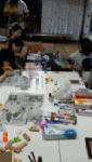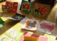 | 梅雨が明けた暑い日、集まった皆さんのハー トも熱く、ステキな作品が出来上がりましたよ (^−^) 材料は、何とティッシュペーパー。ホントはロー ションティッシュのような手触りの柔らかいティ ッシュだと色の乗りも違うようなのですが、ふつ うので全然問題ありません。フレームの大きさ に合わせて切り、2枚重ねのを1枚ずつには がします。4つ折りにしてマジックで好きなよう に描き、広げると思いがけない模様になるの です。 |