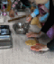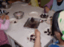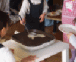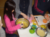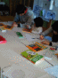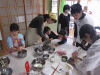 「世界で一つだけのケーキを作ろう!」という企画。まずは生ク リームの泡立てからスタート。ただ混ぜるだけなのに”甘いもの” というだけでワクワクします。 次はプロの技を見る番。四角くて大きなチョコレートケーキに、 チョコクリームをきれいに塗って飾り付け、果物をたっぷり乗せま した。やっぱプロの手つきはさすがです。食い入るように見つめ る目が、皆キラキラ輝いていたのは言うまでもありません。 そして今度は自分で作って食べる番。クレープを焼くのにも挑 戦して、上手に焼けました。クリームも果物も載せたい放題! あれこれ工夫しながら盛りつけ、「家ではあり得ないッ」と言うく らい食べました。 |