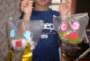 ジックで絵を描いて8等分に切り分け、割り箸をさすだけ。両手で はさんで回しながら差し出すと飛びます。単純だけと面白い。それ が楽しいんですよね〜! 子育てに追われてても、お母さんがリフレッシュする時間を大切