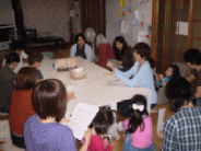 | 子ども達の遊び相手をしてくださったのは、水嶋洋子 先生です。頑張ってるお母さん達に優しいアドバイスも してくださいました。 |