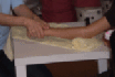 なめらかになった生地を座布団のように丸めてから、めん棒でのばします。めん棒に巻き付けて、押して広げて・・・結構力がいりました。 3oくらいになったら生地の折り目が重ならないように屏風畳みにして切ります。 |