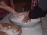 ![]() まず、粉と塩水をビニール袋に入れて混ぜます。 分量を正確に測るのがコツ。粉っぽくなくなったら しばらく置いて熟成させます。 粉と水がなじんだら、足で踏み踏み・・・ 子供たちも楽しそう! ![]() ![]() もちろん、本場の奥久慈シャモも入ってます。 |