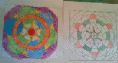 次は課題の『曼荼羅』。3種類から1枚選んで、クレヨンと色鉛筆、どちらでも自分の好みに合わせて塗るのです。はじめは少し迷いがちだったけど、塗っているうちに集中しはじめ、だんだん無言になっていきます。集中して取り組むのも大事なのだと教わりました。ひとしきり没頭したらなんだか頭がスッキリした気がしました。 ![]() 同じ模様でも塗る人によって全く異なります |
