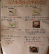 | せっかくだからメニューを書いてもらいました。 1回くらい聞いても覚えられないんだけどね・・・ ○ファルファッレのトマトソース ○タリアテッレのジェノヴェーゼ(バジルソース) ○パッパルデッレ・マスカルポーネの トマトクリームソース ○ピーチのジェノヴェーゼ(太い麺) ○ファルファッレのネギとアンチョビソース |
