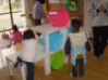 | 武藤先生をお迎えするのは2回目です。今日はどんな楽しいことがや れるかしら? とワクワクしていました。 最初は風船バレー。大きなビニール袋に風船が3つ入っている『特大 風船』を使い、ちょっと緊張気味だった子ども達も大きな風船を目で追い 表情が緩みました。 次は大人の番、タオルを持ってストレッチです。ふだん縮こまっている部 分をじわ〜っと伸ばすと「アイタタタッ!」と言いながらも気持ちよくなりま す。寝っ転がって運動していると子ども達も一緒にゴロゴロしはじめまし た。「痛気持ちいい」(ちょっと痛いけど気持ちいい)のが程良いとのこと。 身も心もほぐれてきました。 さて、今回は絵の具でお遊び。絵の具をポタポタっと紙に落として半分 に折ると思いがけない模様になります。それをピンキングばさみで切って色 紙に貼ると、あっという間に立派な芸術作品の出来上がり! お母さん 達も「絵の具を使うの何年ぶりかしら?」なんて言いながら不思議な図 柄が現れるのを楽しみました。 |